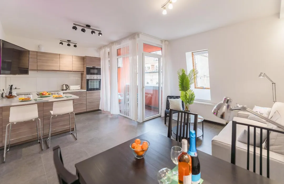 El Apartamento Funky Breeze & Balcony tiene un congelador, un horno y una estufa en una cocina. El Apartamento Funky Breeze & Balcony está a poco más de 5 minutos en coche de la estación de metro Vörösmarty utca y a tan solo 250 metros de la parada de autobús Ferdinand hid.